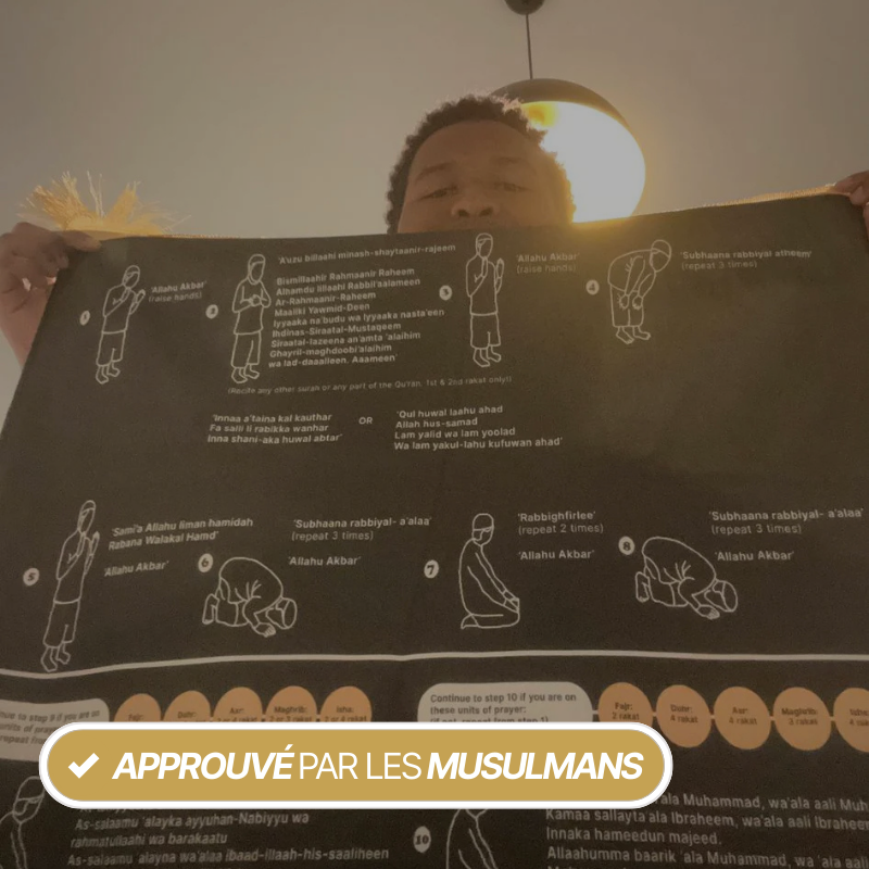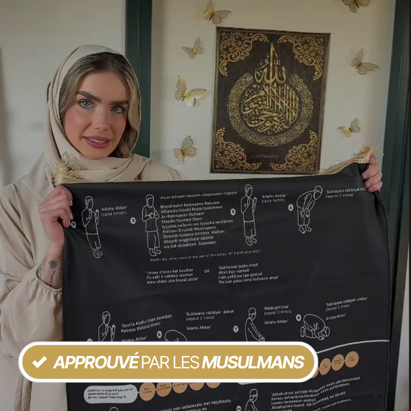 Un tapis phonétique qui vous guide pas à pas dans chaque étape de la prière, en apportant sérénité, confiance et confort.